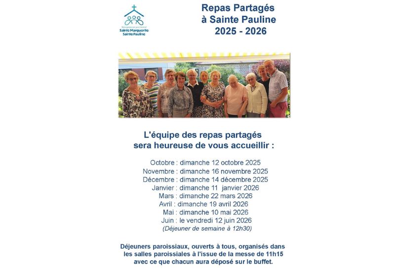 Déjeuners paroissiaux, ouverts à tous, organisés dans les salles paroissiales à l’issue de la messe de 11h15 avec ce que chacun aura déposé sur le buffet.